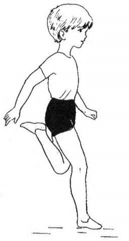 Для совершенствования бегового шага предлагается следующее задание: бежать, сильно сгибая ноги в коленях и ударяя пятками по ягодицам (рис. 144). Это упражнение очень нравится детям, однако надо учитывать довольно большую нагрузку, которое оно дает, поэтому следует ограничиваться 10–15 шагами и повторять их с, перерывами 3–4 раза подряд.