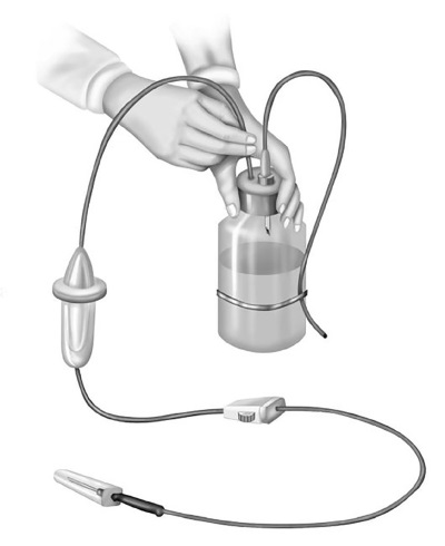 Закрутите винтовой зажим, снимите защитный колпачок с иглы, расположенной на коротком конце одноразового устройства, проколите резиновую пробку флакона под углом 90 градусов и введите иглу до упора.