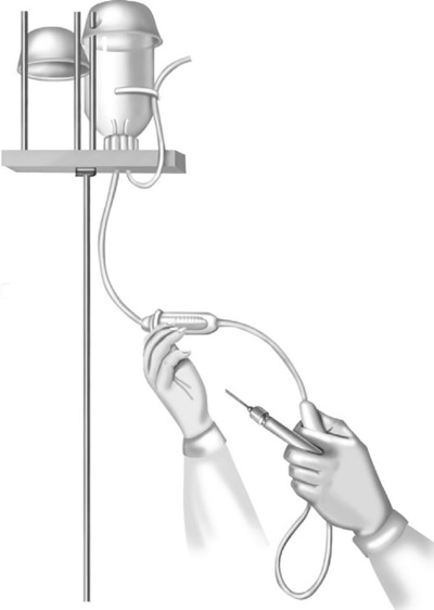 Откройте винтовой зажим, медленно заполняя длинную трубку одноразового устройства до полного вытеснения пузырьков воздуха и появления капелек препарата из соединительной канюли.