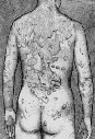 Высыпание пузырей на коже начинается с груди и спины. Затем количество пузырей увеличивается. Пузыри локализуются на неизменной коже, наполнены прозрачным серозным содержимым и имеют различную величину. Просуществовав несколько дней, пузыри вскрываются, обнажая эрозии с обильно отделяющимся клейким густым экссудатом. В начале заболевания эрозии сравнительно быстро эпителизируются, оставляя после себя значительно выраженную пигментацию.