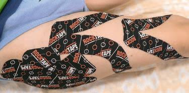 Техника тейпирования: 1) послабляющая коррекция правого т/б сустава с натяжением каждого тейпа 70 % (рис. 70, а); 2) фасциальная коррекция передней и задней групп мышц бедра по типу «голова барана» с натяжением 40 %.