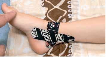 Был проведен тейпинг коленного сустава (рис. 71, в) с целью увеличения рефлекторного и постурологического ответа при тейпировании правого голеностопного сустава, а также левой группы ягодичных мышц (рис. 71, а, б), поскольку предварительный осмотр показал явное отставание данной группы в работе (симптом Тренделенбурга слева).
