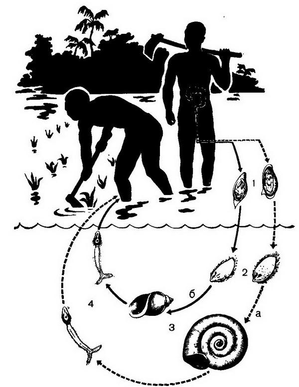 Проникая через стенки кровеносных сосудов, яйца скапливаются в просвете мочевого пузыря или кишечника и выделяются наружу. При попадании их в водоем происходит развитие личинок в моллюсках. Затем личинки покидают промежуточного хозяина и активно проникают через., кожу в тело человека, например, во время купания (рис. 4.14).