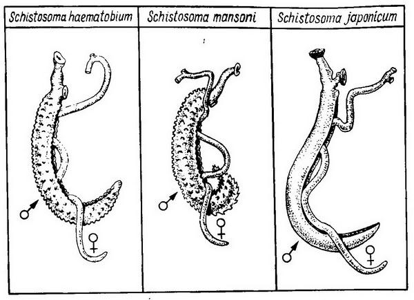Шистосомы, или кровяные сосальщики, раздельнополые трематоды, размером 4–20 мм. У человека встречается три вида рода Schistosoma (рис. 4.13, см. рис. 4.3)