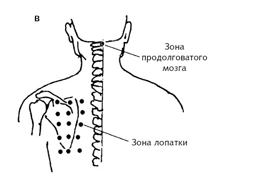 4. Зону лопатки (особенно левой), рис. 1, в.