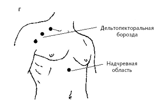 5. Область прикрепления большой грудной мышцы (дельтопекторальная борозда проходит от подмышечной впадины по грудинной стороне плечевого сустава к середине ключичной кости и служит водоразделом между грудью и плечевым суставом), см. рис. 1, г.