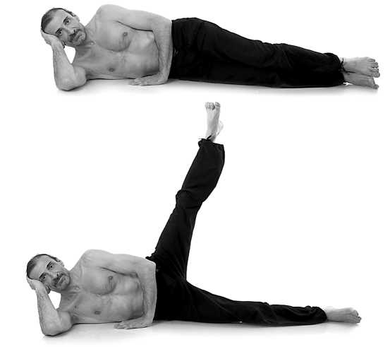 1. Ложитесь на правый бок, ноги вытяните вперед, примите позу, как на верхнем рисунке.