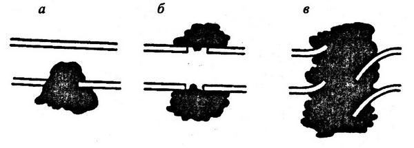 а – полный разрыв стенки уретры; б – простой перерыв уретры; в – сложный перерыв уретры (по Н. А. Лопаткину, 1998)