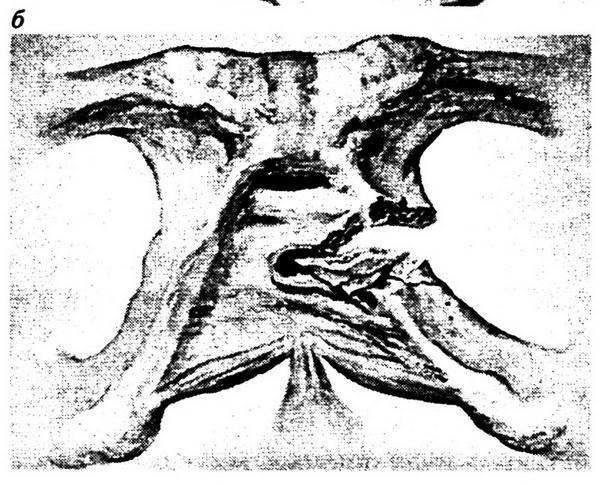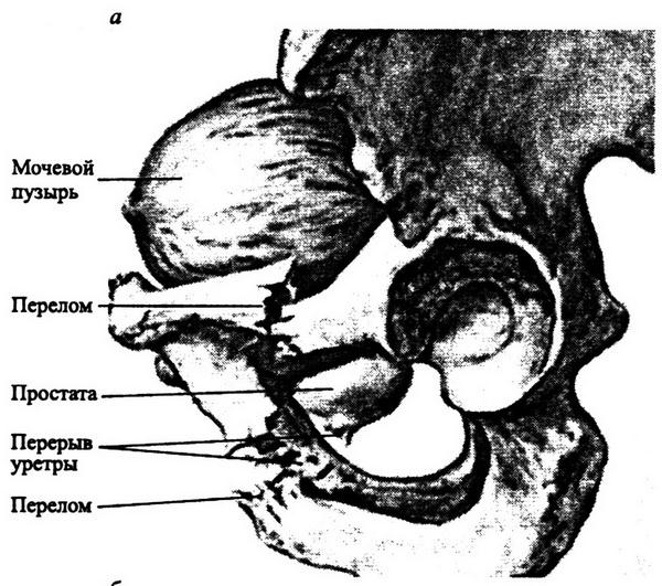 Рис. 8.24. Разрывы мочеиспускательного канала при переломах костей таза: а – перелом лонной и седалищной костей слева с перерывом уретры в перепончатом отделе; б – повреждение уретры острым осколком нисходящей ветви лонной кости слева