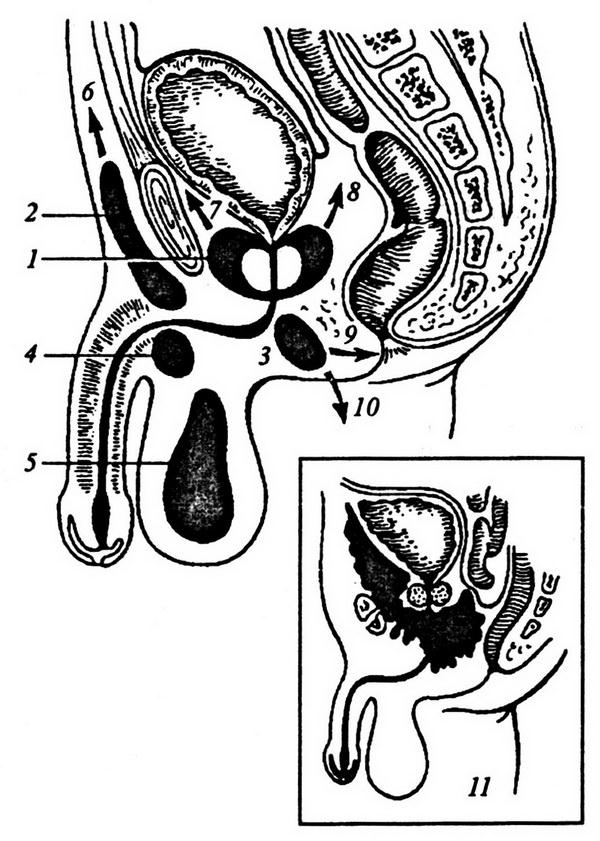 1 – околопростатический затек; 2 – предлобковый затек; 3 – промежностный затек; 4 – затек в кавернозное тело; 5 – затек в мошонку; 6 – затек в брюшную стенку; 7 – затек в предпузырную клетчатку; 8 – затек в забрюшинную клетчатку; 9 – затек в седалищно–прямокишечную ямку; 10 – затек в клетчатку бедра; 11 – распространение затеков мочи при разрывах задних отделов уретры (по Н. А. Лопатхину, 1998)