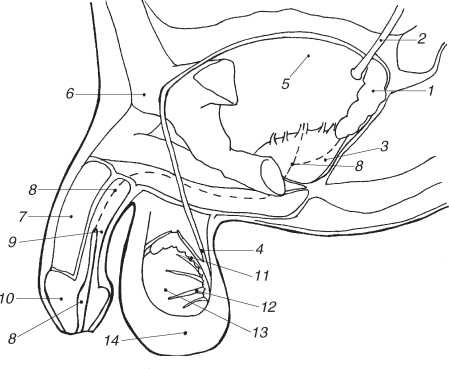1 — семенной пузырек; 2 — выводной проток; 3 — простата; 4 — семявыносящий проток; 5 — мочевой пузырь; 6 — лобковая кость (срез); 7 — кавернозное (пещеристое) тело полового члена; 8 — мочеиспускательный канал; 9 — кавернозное тело уретры; 10 — головка полового члена; 11 — придаток яичка; 12 — семенные канальцы; 13 — яичко; 14 — мошонка