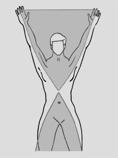 Солнечное сплетение начинает выглядеть объемным и отечным, с отсутствующей белой линией живота, как «курдюк». Это будет вид обычного сосудисто-мышечного гипертонуса, препятствующего току энергии и воды (крови и лимфы) (рис. 29). Жидкость скапливается над этим блоком, приводя к отеку и выпиранию солнечного сплетения.