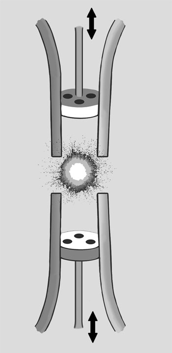 Вакуумом поршни тянут воду за собой и опускают ее вниз, пропуская ее под напором через отверстия, предназначенные для прохода лимфы, артериальной и венозной крови. Нижняя жидкость должна просачиваться через эти отверстия вверх, а верхняя опускаться вниз. При этом между двумя поршнями формируется зона вакуумной растяжки, растягивающая оба «сосуда» тела друг от друга. В этом месте между ступенями «ракеты» всегда идут процессы холодного термояда.