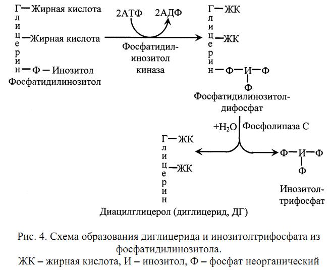 Эти вторые посредники являются производными фосфолипида мембран, фосфатидилинозитола. Указанный фосфолипид фосфорилируется в мембране под действием фермента фосфатидилинозитолкиназы при участии 2 молекул АТФ (рис. 4. .