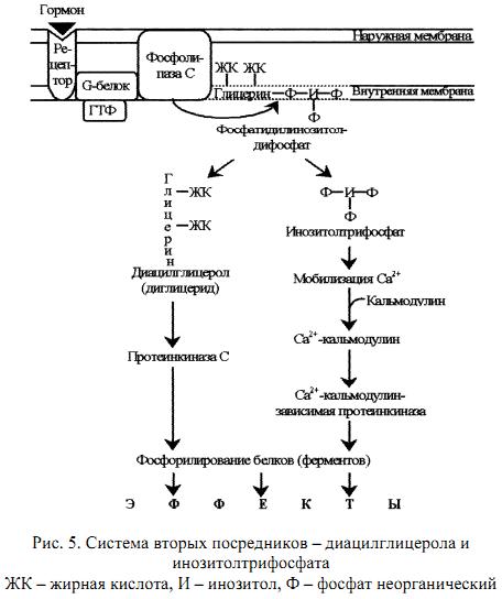 Биологические эффекты этих двух вторых посредников реализуются по-разному. ДАГ активирует Са2+-зависимую протеинкиназу С, которая катализирует фосфорилирование внутриклеточных ферментов, изменяя их активность. ИФ3 связывается со специфическим рецептором на ЭПР, способствуя выходу из него Са2+ в цитоплазму. Далее Са2+ связывается с кальмодулином и активирует Са2+-кальмодулин-зависимую протеинкиназу, которая катализирует фосфорилирование ферментов, изменяя их активность (рис. 5.)
