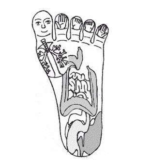 • Зоны подобия внутренних органов грудной клетки (легкие, молочные железы, сердце) размещаются в верхней половине стопы.