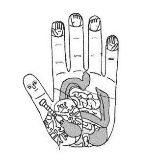 • Рефлекторные зоны головы и шеи размещены на больших пальцах. Дистальная фаланга большого пальца, то есть наиболее отдаленная от центра туловища (на ней крепится ногтевая пластинка), уподобляется голове, а вторая фаланга — шее.
