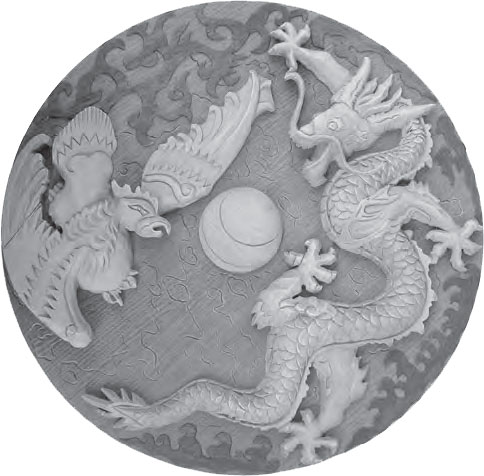 «Дракон и феникс, играющие луной» Резьба по дереву в исполнении М. Роттера