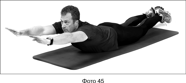 3. Одновременно оторвите руки и ноги от пола (см. фото 45). Удерживайте положение пять секунд, затем расслабьтесь.