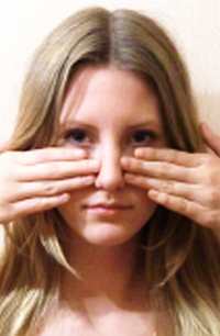 Приоткройте или просто расслабьте рот, чтобы избежать заломов под нижней губой. Поставьте пальцы рук на скуловые кости, как это показано на изображении и, удерживая нос пальцами, работайте МЫШЦАМИ носа и сужая носовые отверстия на счет раз-два-три.
