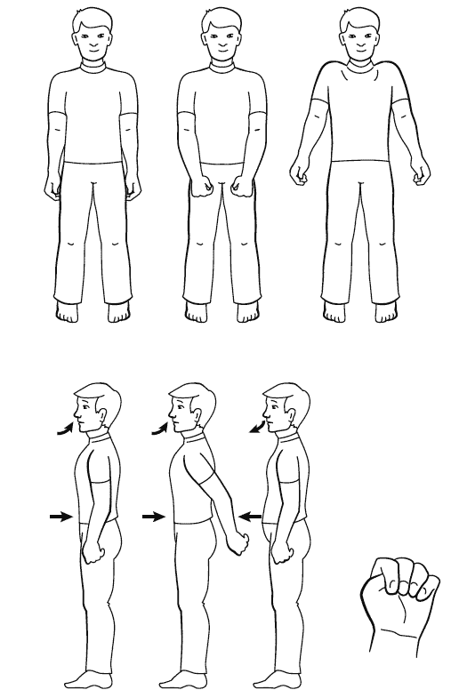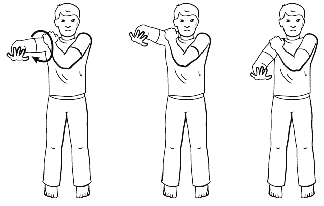 Выполнять в положении стоя или сидя. Ладонью левой руки взяться за правое плечо, правую руку согнуть в локте и поднять до высоты плеча. Выполнить восемнадцать круговых движений правой рукой. То же самое повторить левой рукой. Упражнение улучшает кровообращение, помогает при воспалении суставов и бессоннице, успокаивает нервную систему.