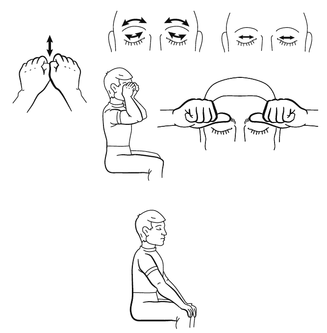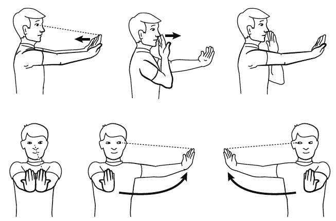 Выполняется сидя или стоя. Голову держать прямо, левая или правая рука вытянута, ладонь выпрямлена и повернута к лицу, средний палец находится на уровне кончика носа. Взгляд сосредоточен на среднем пальце. Медленно приближать руку до соприкосновения среднего пальца с кончиком носа, не отрывая взгляда от него, затем медленно отодвигать. Проделать каждой рукой по пять раз. Правую руку вытянуть, поднять до уровня лица, ладонь повернута к лицу. Взгляд сосредоточен на всех пальцах. Медленно отвести руку вправо, не упуская ее из виду, до момента исчезновения, после чего взгляд переносится на левую руку, которая уже заняла место правой руки (вытянута и поднята до уровня лица, ладонь к лицу). Так же медленно отвести левую руку влево, сопровождая взглядом, а правую вернуть в исходное положение. Голова при выполнении упражнения находится прямо. Проделать упражнение по пять раз в каждую сторону. Упражнение улучшает зрение, уменьшает дальнозоркость у пожилых людей.