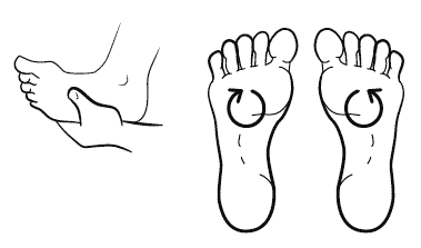 Выполнять в положении сидя. Левой рукой произвести стократный растирающий массаж средней части правой ступни. То же самое повторить для левой ступни. Упражнение помогает при болях в суставах и ревматизме.