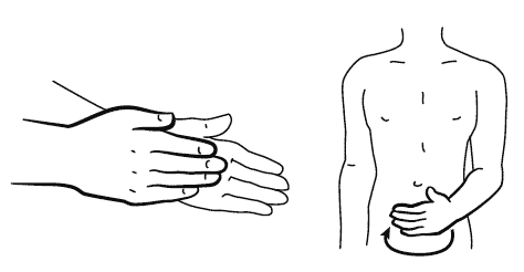 Выполнять в положении сидя или лежа. Ладони потереть друг о друга до нагревания, после чего левой рукой проделать стократный массаж низа живота, затем опять согреть ладони и проделать то же правой рукой. Массаж живота помогает всасыванию пищи и улучшает перистальтику кишечника.
