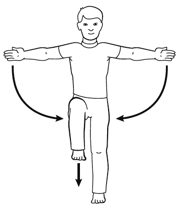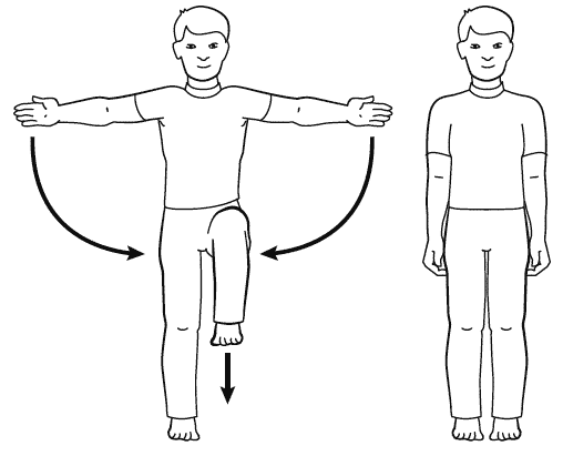 Встать, руки развести в стороны и поднять до плеч, одновременно подогнуть одну ногу, делая вдох, опустить руки и ногу, сделать выдох. Упражнение повторять по пять раз для каждой ноги. Такие действия укрепляют ноги и тренируют вестибулярный аппарат.