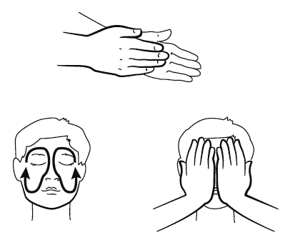 Выполнять в положении стоя или сидя. Потереть ладони друг о друга до согревания и произвести массаж лица 36 раз, за один раз считая движение вверх-вниз. Необходимо массировать все лицо, в том числе выступающие части и впадины. Упражнение благоприятно влияет на лицевые нервы, улучшает зрение, укрепляет зубы. Еще одно преимущество – предохраняет от появления морщин.