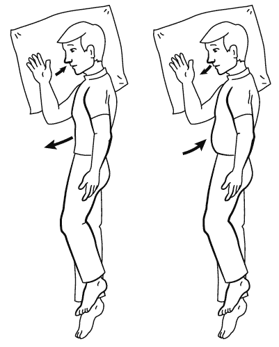 Больной лежит на боку на ровной, мягкой постели, голова слегка наклонена вперед. Одна рука повернута ладонью вверх. Другая – свободно вытянута ладонью вниз и лежит на бедре. Одна нога вытянута, другая – лежит поверх нее в слегка согнутом положении. Взгляд направлен на переносицу, рот закрыт. Если в комнате прохладно, можно накрыться одеялом. Произвести 50 глубоких дыханий через нос, выпячивая живот при вдохе, и втягивая при выдохе.