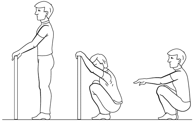 Выполнять в положении стоя. Ноги находятся на ширине плеч. Держаться вытянутыми руками за спинку кровати или стула, произвести 3–4 полных приседания. При приседании делать выдох, при подъеме – вдох. Это упражнение облегчает боль в суставах ног, укрепляет мышцы ног и тренирует равновесие.