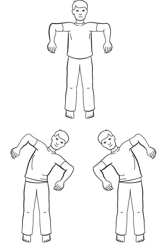 Верхнюю часть корпуса поворачивать восемнадцать раз слева направо, руки находятся на высоте плеч, при повороте делать выдох, а на вдохе вернуться в исходное положение. Упражнение улучшает кровообращение и дыхание.