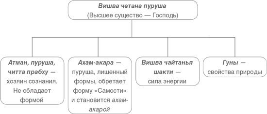 Пуруша (Атман, Созерцатель, Сущность, Душа) – полностью лишенный формы, неизменный, нетленный, лучезарный. Он обитает в теле, хотя и преобладает над природной реальностью. Эта тема крайне важна, поэтому я подробно рассматриваю ее в главе VI.