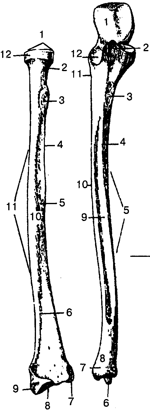 А — лучевая кость: 1 — головка лучевой кости; 2 — шейка лучевой кости; 3 — бугристость лучевой кости; 4—межкостный край; 5— передняя поверхность; 6— передний край; 7— локтевая вырезка; 8— запястная суставная поверхность; 9 — шиловидный отросток; 10— латеральная поверхность; 11 — тело лучевой кости; 12— суставная окружность; Б — локтевая кость: 1 — блоковидная вырезка; 2 — венечный отросток; 3 — бугристость локтевой кости; 4— передний край; 5— тело локтевой кости; 6— шиловидный отросток; 7— суставная окружность; 8 — головка локтевой кости; 9 — передняя поверхность; 10 — межкостный край; 11 — гребень супинатора; 12 — лучевая вырезка