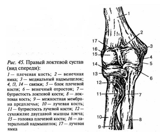Локтевой сустав (articulatio cubiti) — сложный, в его состав входят плечелоктевой, плечелучевой и проксимальный лучелоктевой суставы. Эти три сустава имеют общую суставную капсулу, которая укреплена лучевой и локтевой коллатеральными связками, а также кольцевой связкой лучевой кости. Локтевой сустав относится к блоковидным суставам: в нем возможны сгибание, разгибание и вращение предплечья (рис. 45).
