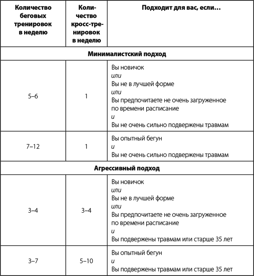 В таблице 12.1 представлены все варианты балансирования беговых и кросс-тренировок с двумя разными подходами и информация о том, каким бегунам лучше всего подходит каждый вариант. Вам может понадобиться поэкспериментировать, чтобы найти баланс, который будет идеальным для вас. Имейте в виду, что идеальный баланс может меняться со временем. В случае сомнений делайте больше кросс-тренировок (поскольку больший объем означает лучшую форму) и меньше бега (поскольку меньше бега значит меньший риск травмироваться).