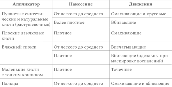 Нанесение: пудры – сухим или влажным спонжем либо кистью из натурального или искусственного ворса; кремы – руками, синтетической кистью или влажным спонжем.