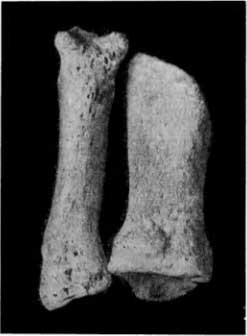 О том, что этот человек долго пользовался этой стопой как органом опоры, можно судить на основании отсутствия каких бы то ни было проявлений атрофии. Пострадавшие в свое время кости, в особенности V плюсневая кость, отличаются достаточной мощностью. Кортикальный слой IV и III плюсневых костей имеет большую толщину, чем это характерно для подобных костей (рис. 44, Б). Это проявление рабочей гипертрофии кости.