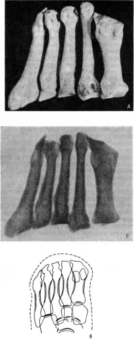 Рис. 44. А — плюсневые кости после излечения от отморожения, адаптационные изменения; Б — рентгенограмма показывает структурные особенности плюсневых костей, благоприятный исход лечения с применением оперативного вмешательства; В — схема с рентгенограммы культи стопы современного человека через 10 лет после операции по поводу отморожения.