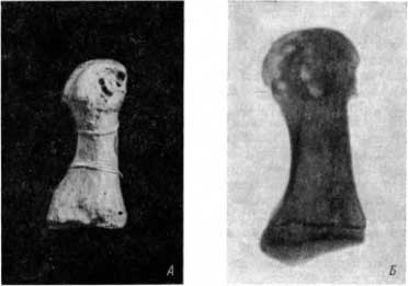Рис. 55. А — следы подагрического поражения на головке I плюсневой кости (XIII–XIV в.); Б — рентгенограмма с препарата; подагрические изменения и сохранение поперечной пластинки в основании кости.
