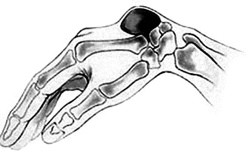 Ганглий представляет собой кистозное образование с типичной локализацией на тыльной поверхности лучезапястного сустава, реже – на ладонной стороне запястья, на стопе (рис. 4.5). Заболевание возникает от постоянного механического раздражения суставной капсулы, сухожильного влагалища или синовиальных сумок.