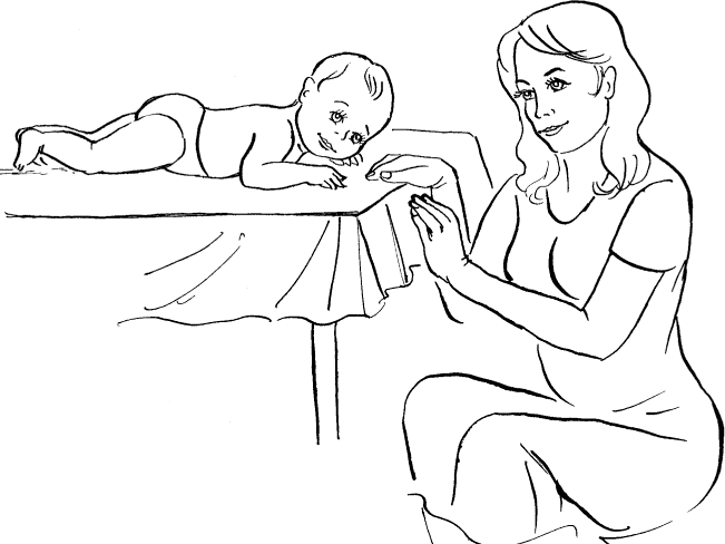 Выкладывая ребенка на животик, старайтесь находиться рядом с ним так, чтобы ваши головы были на одном уровне. Например, он лежит на столе, а вы стоите на коленях перед ним или сидите, в зависимости от того, на каком уровне высоты он находится. Видя вас, малыш будет стараться удерживать голову. Так вы будете тренировать у него формирование шейного изгиба позвоночника.