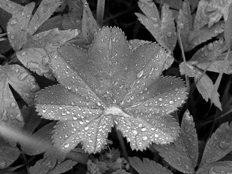 Alchemilla vulgaris L. – в переводе с латинского название буквально означает «трава алхимиков». По старым легендам, воду, которая скапливается в ее листьях, алхимики использовали для получения философского камня и эликсира жизни. В качестве приворотного зелья манжетку использовали Медея, Геката, Цирцея, Афродита[9]. Узнать растение можно по листьям: они похожи на старинные манжеты с фестонами. И не зря ее прозвали «сверкающей»! На каждом маленьком зубчике висит капля росы, по краю листа они образуют сверкающую кайму. А в его центре, где все жилки сходятся к черешку, лежит самая крупная капля, похожая на ртутную жемчужину, в которой все, как в зеркале, отражается. Она, как и настоящая ртуть, не стекает с листа, даже если его тронешь. Вот поэтому еще названо это растение небесной росой, ресничкой, боговой слезой.