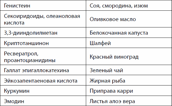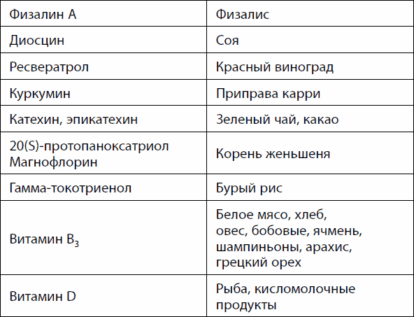 А что будет, если приглушить активность киназы mTOR? Генетические исследования, проведенные на животных, показали, что это эффективный способ замедлить старение и продлить жизнь, но при этом страдает качество жизни, так как контролируемые mTOR процессы важны для клеток. Были найдены вещества-ингибиторы, подавляющие активность mTOR. Прием одного из таких препаратов в экспериментах на средневозрастных мышах позволил продлить жизнь на 20 %. Однако не обошлось без побочных эффектов, связанных с необходимостью некоторого уровня активности mTOR для клетки. В этих экспериментах использовались вещества, очень сильно подавляющие активность mTOR. Однако во многих продуктах питания есть менее селективные ингибиторы, с меньшей эффективностью подавляющие mTOR (табл. 22). И это залог меньших побочных эффектов для роста клеток и регенерации тканей.