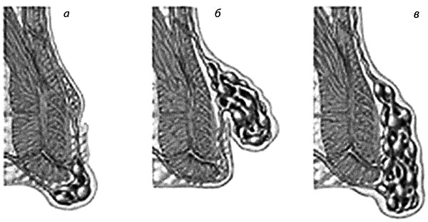 Внутренний геморрой. При внутреннем геморрое имеется варикозное расширение геморроидальных вен, которые находятся в глубине анального канала (рис. 4.2, а), поэтому при обычном осмотре такие геморроидальные узлы не видны. Для того чтобы их увидеть, приходится прибегать к специальным методам исследования: аноскопии, ректоскопии. Также такие узлы можно выявить и при пальцевом ректальном исследовании.