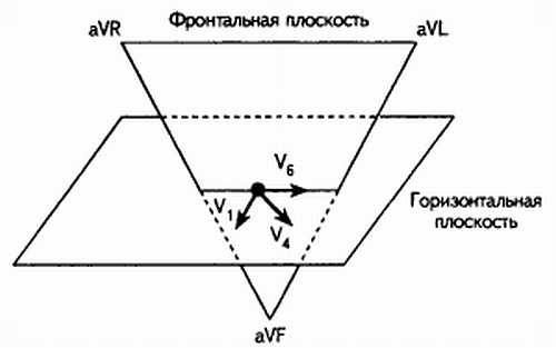 Ранее было отмечено, что грудные отведения записывают потенциалы сердца с иной окружности электрического поля сердца, нежели стандартные и усиленные однополюсные отведения. Указывалось конкретно, что грудные отведения отображают изменение результирующего вектора возбуждения сердца не во фронтальной, а в горизонтальной плоскости.