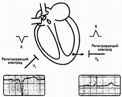 Поэтому принято считать, что в отведении V6 зубец R свидетельствует о возбуждении левого (своего) желудочка, а зубец S — правого (противоположного) желудочка. В отведении V1 — обратная картина: зубец R — возбуждение правого желудочка, зубец S — левого.
