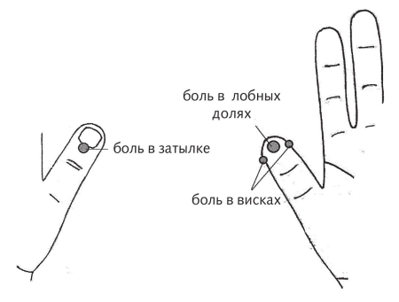 Если боль сосредоточена в висках, попробуйте промассировать «височки» большого пальца, по обе стороны от ногтевой фаланги. А боль в затылке проецируется обычно под основание ногтя большого пальца, эту зону и надо массировать. Расположение зон подобия смотрите на рисунках 47, а, б.