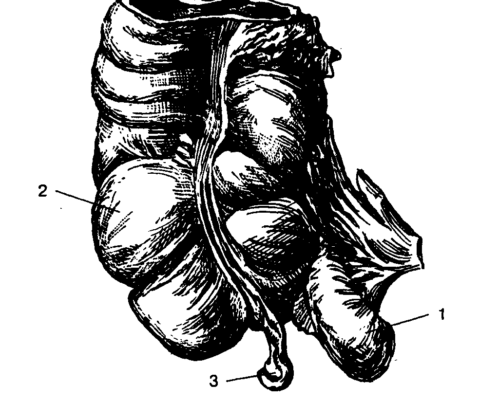 Аппендикс:1 – подвздошная кишка; 2 – слепая кишка; 3 – аппендикс